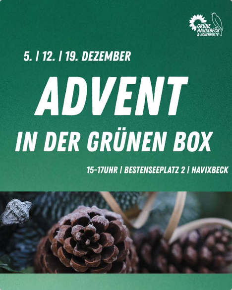 Der Ortsverband der Havixbecker Grünen lädt an den drei adventlichen Freitagen (5., 12. und 19. Dezember) jeweils von 15 bis 17 Uhr in die „Grüne Box“ am Bestenseeplatz 2 ein, zum Aufwärmen, Kennenlernen und für Gespräche. Mitgebracht werden können Fragen, Anregungen und Ideen, die die grüne Arbeit in Havixbeck und die Weiterentwicklung des Ortes betreffen, heißt es in der Pressenotiz. Während des Kommunal-Wahlkampfes fanden diese Gespräche oft am Wahlkampfstand statt. Nun möchten die Havixbecker Grünen gerne das Gesprächsangebot aufrecht erhalten. Der Advent in der „Grünen Box“ ist der Auftakt der von den Grünen geplanten Reihe „Grüner Treff zur Marktzeit“.